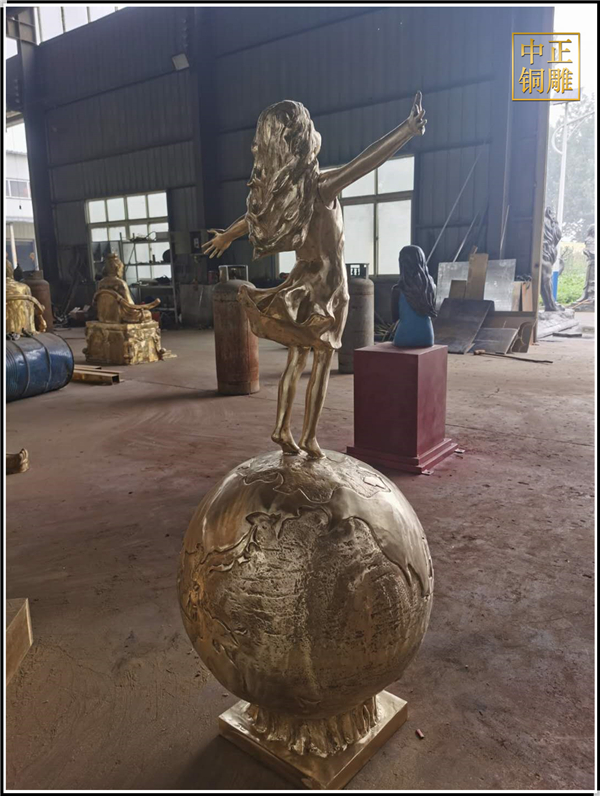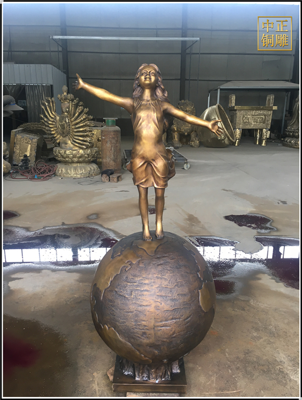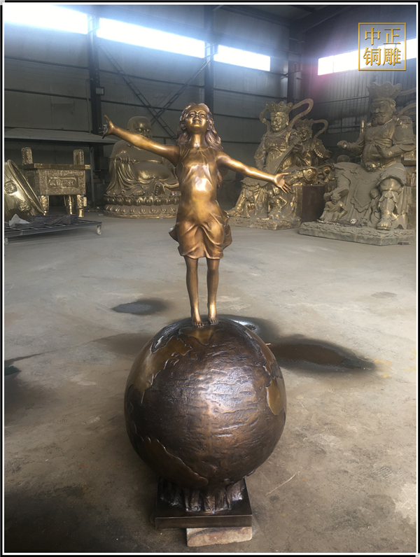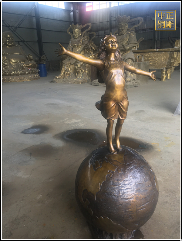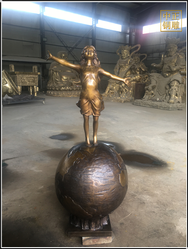 我公司生產的這件高1.5米的站在地球上的小女孩人物銅雕塑已發往江蘇省鹽城市,這件站在地球上的小女孩人物銅雕塑是以保護地球環境為主題設計制作的。